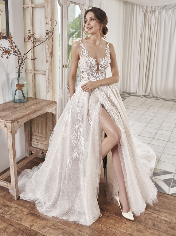 Elegantie ontmoet nostalgie met de basque korset-top, een klassieke stijl die terug is van weggeweest. Deze trouwjurken trend benadrukt het vrouwelijke silhouet met een strak lijfje en een subtiele uitlopende rok. Perfect voor bruiden die houden van een tijdloze, elegante look. Bij Charmé Bridal vind je een uitgebreide collectie van trouwjurken met dit prachtige detail.